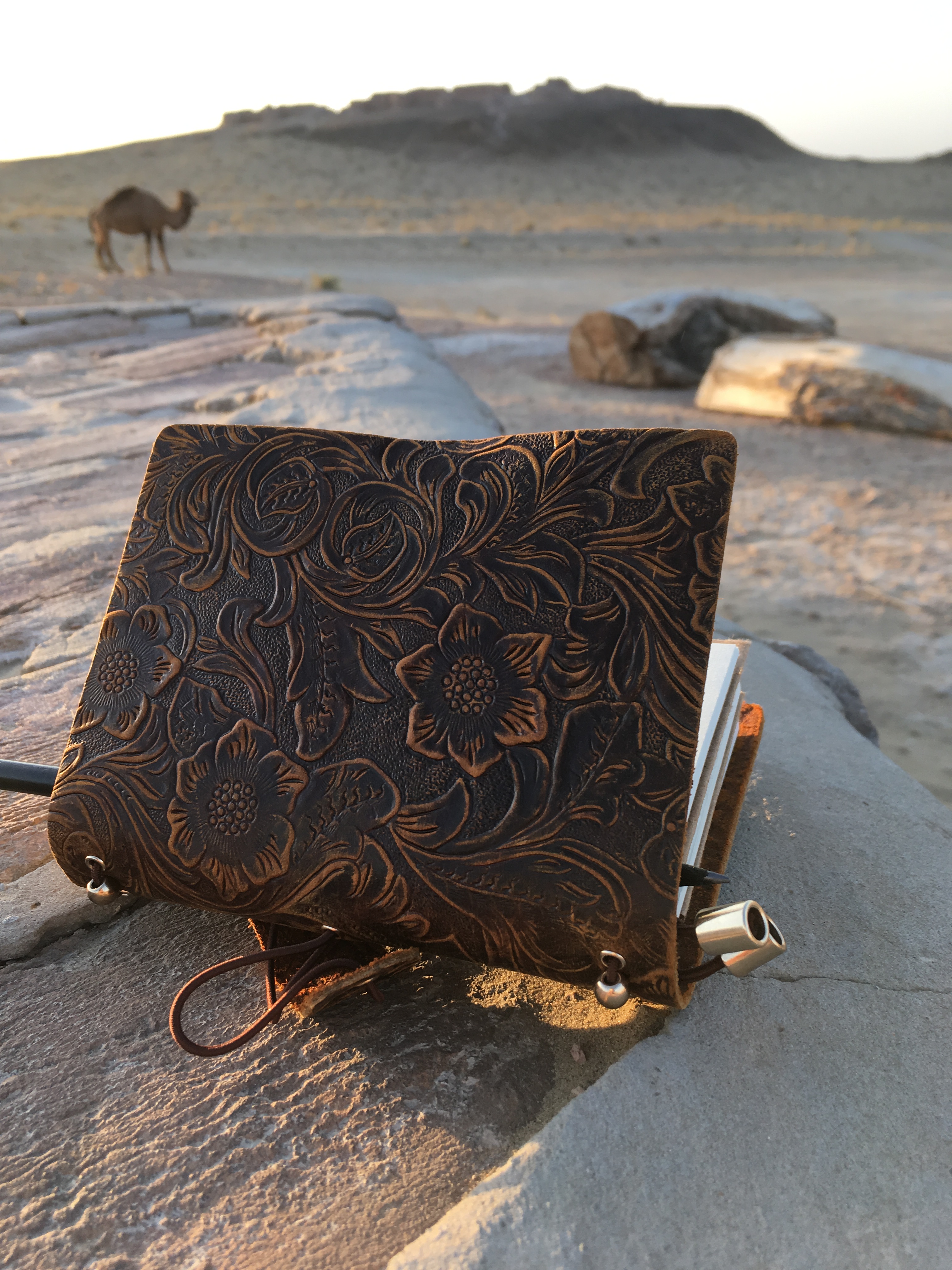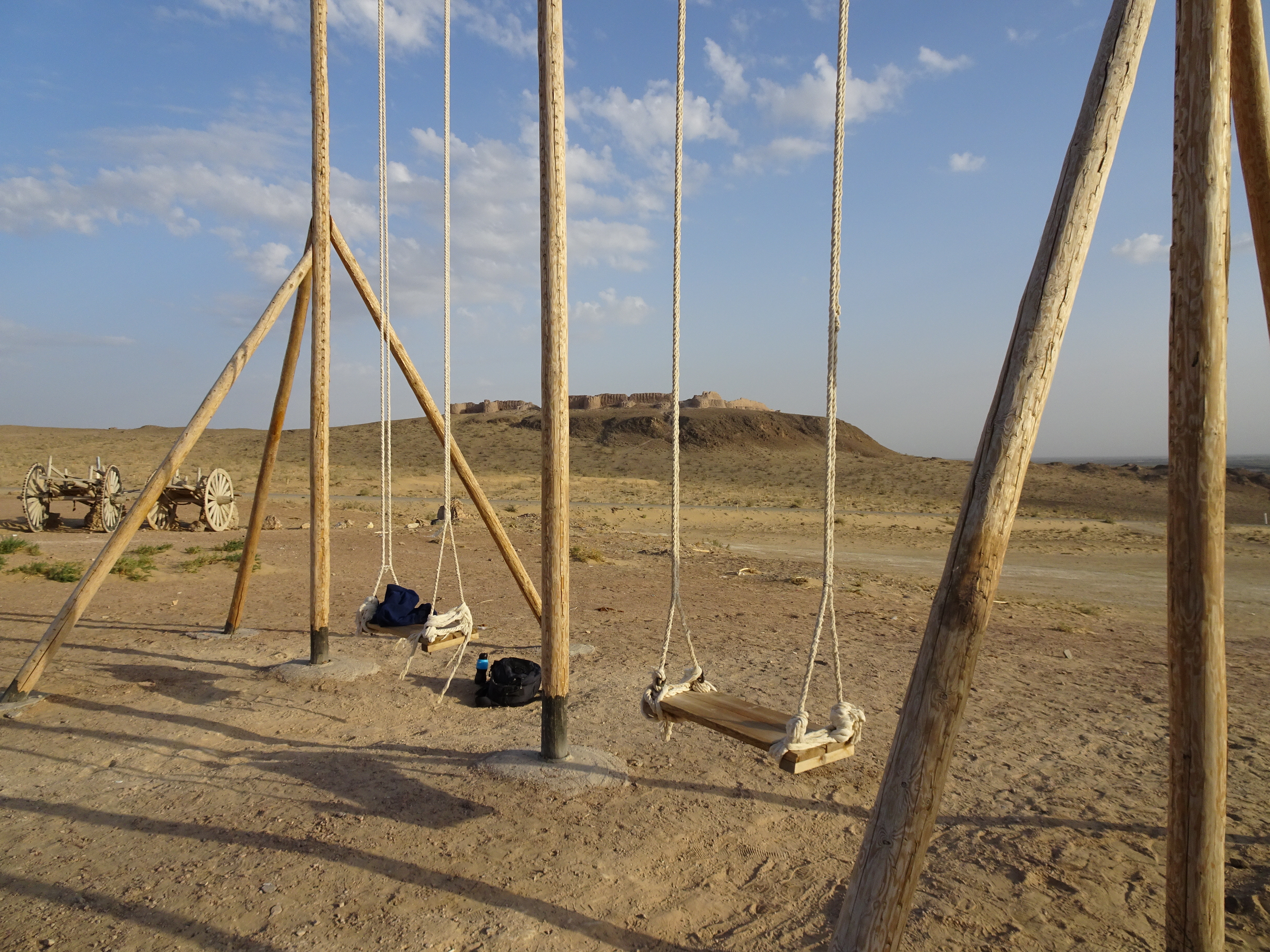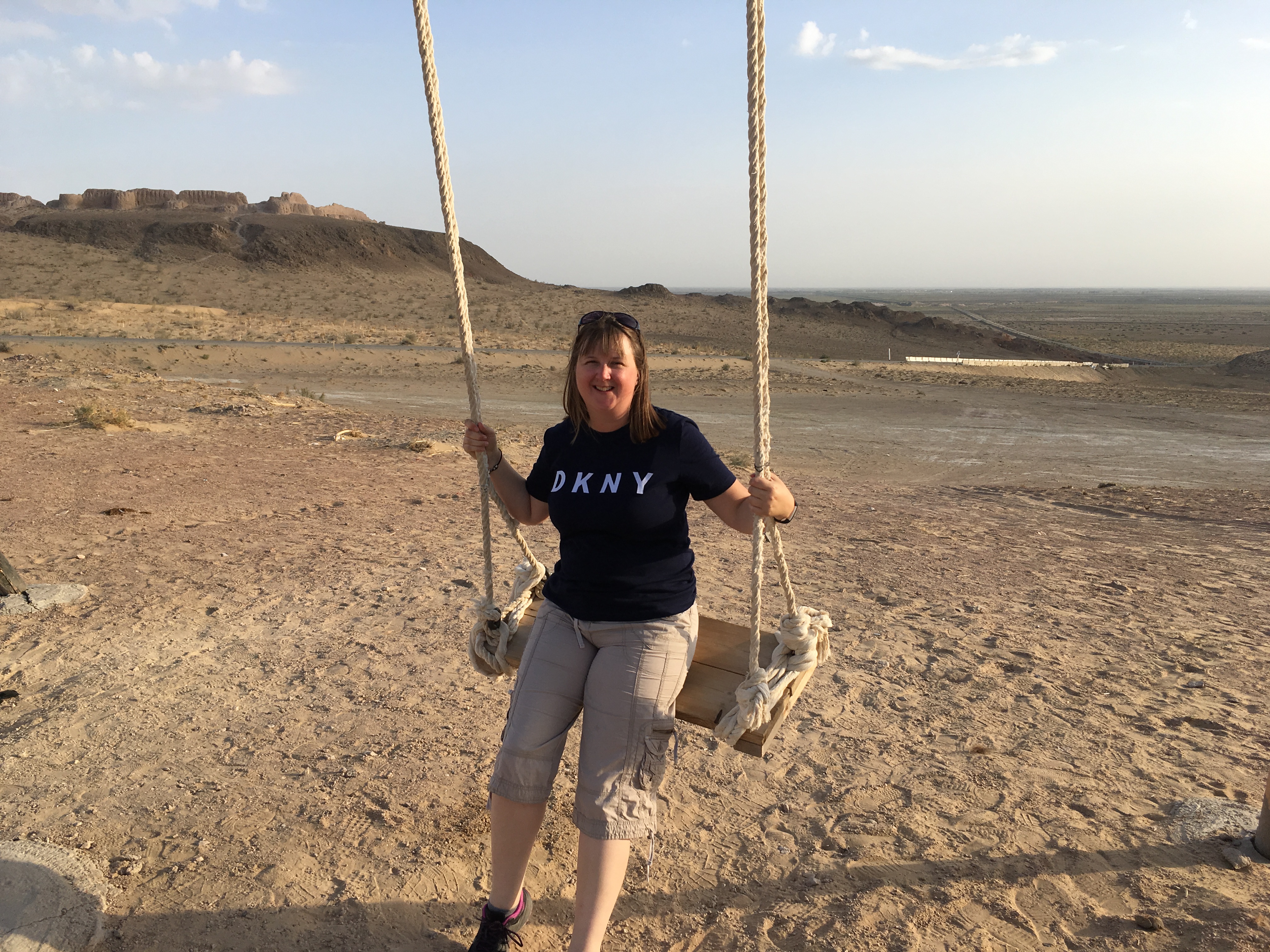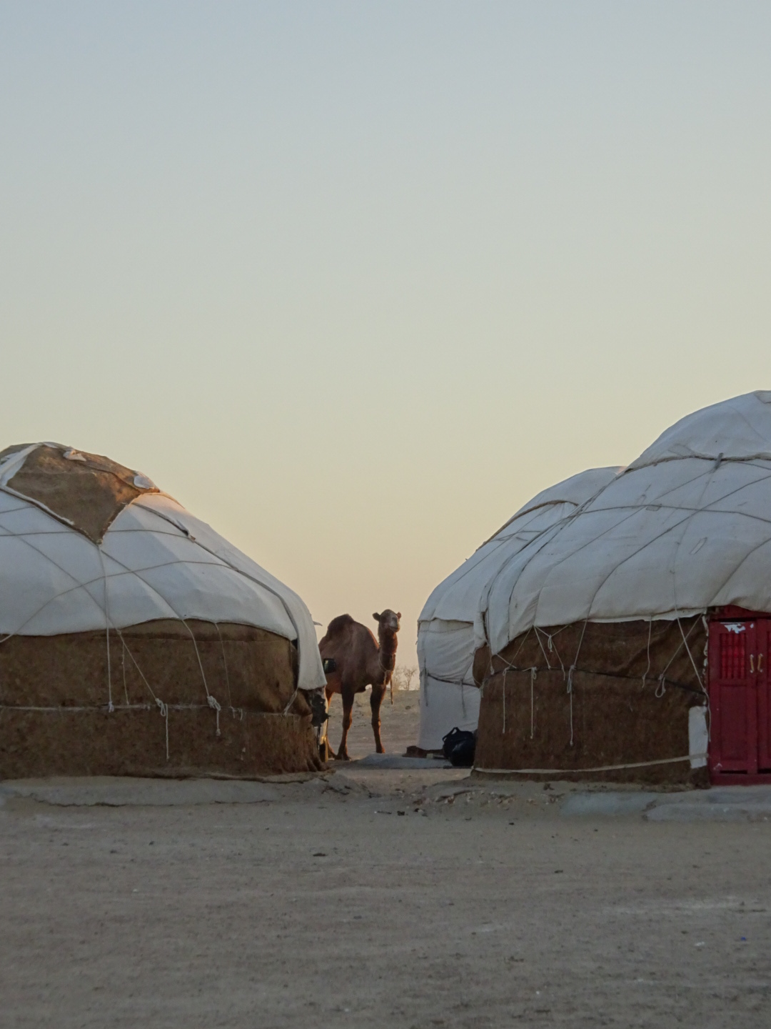 Our yurts allocated, we look across the valley and pose for photos on the swing with a view. A braying and snorting accompanies the herd of camels coming back from their day in the desert; we watch them jostle and scuffle into their night pen.
