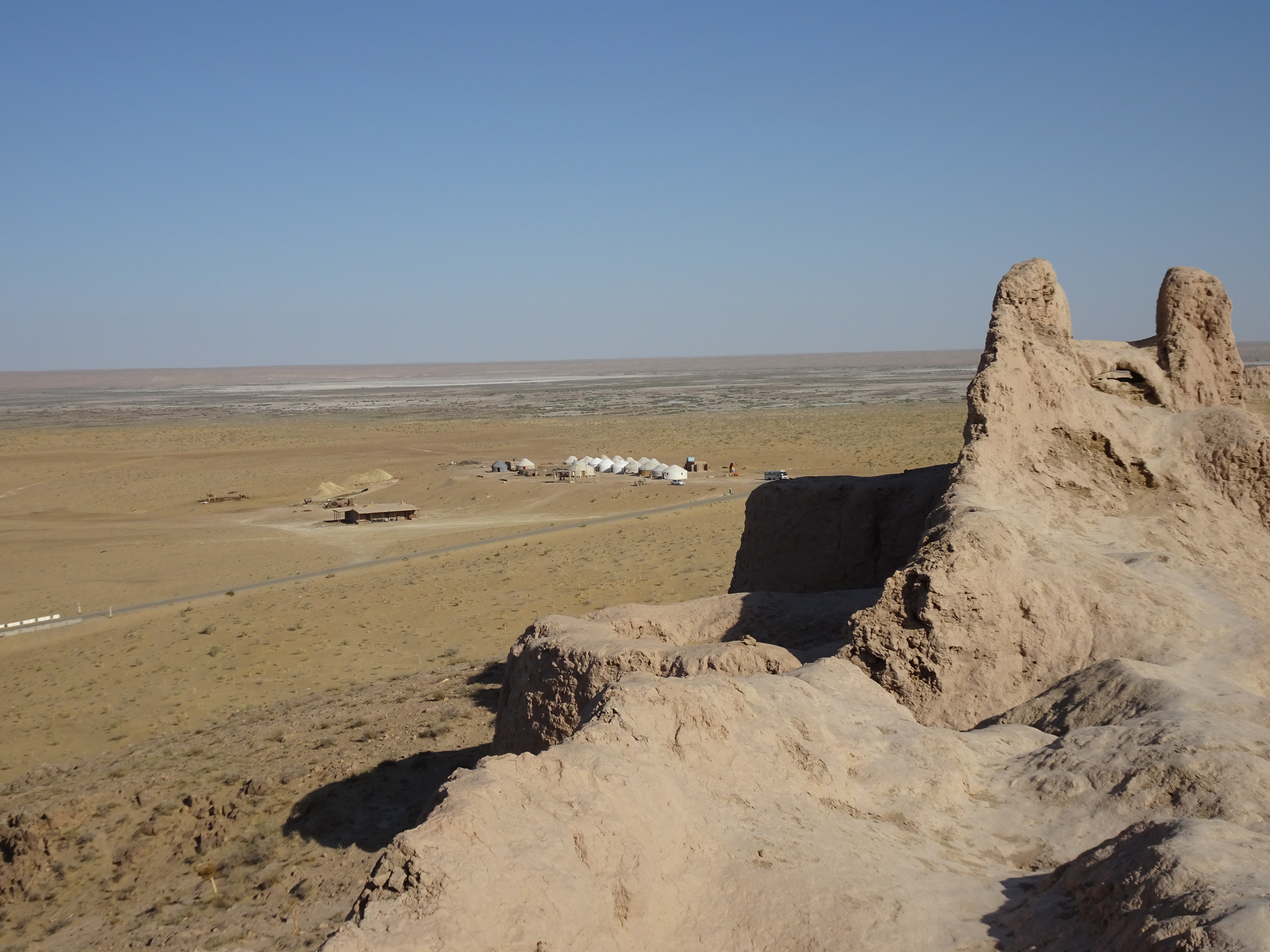The day after the trip to the Aral sea, we travel across the desert. Our yurt camp for the night is perched on top of a hill alongside a desert castle. We stop to take photos of both from the road side. We are enthusiastically hugged on arrival by the matriarch of the camp.