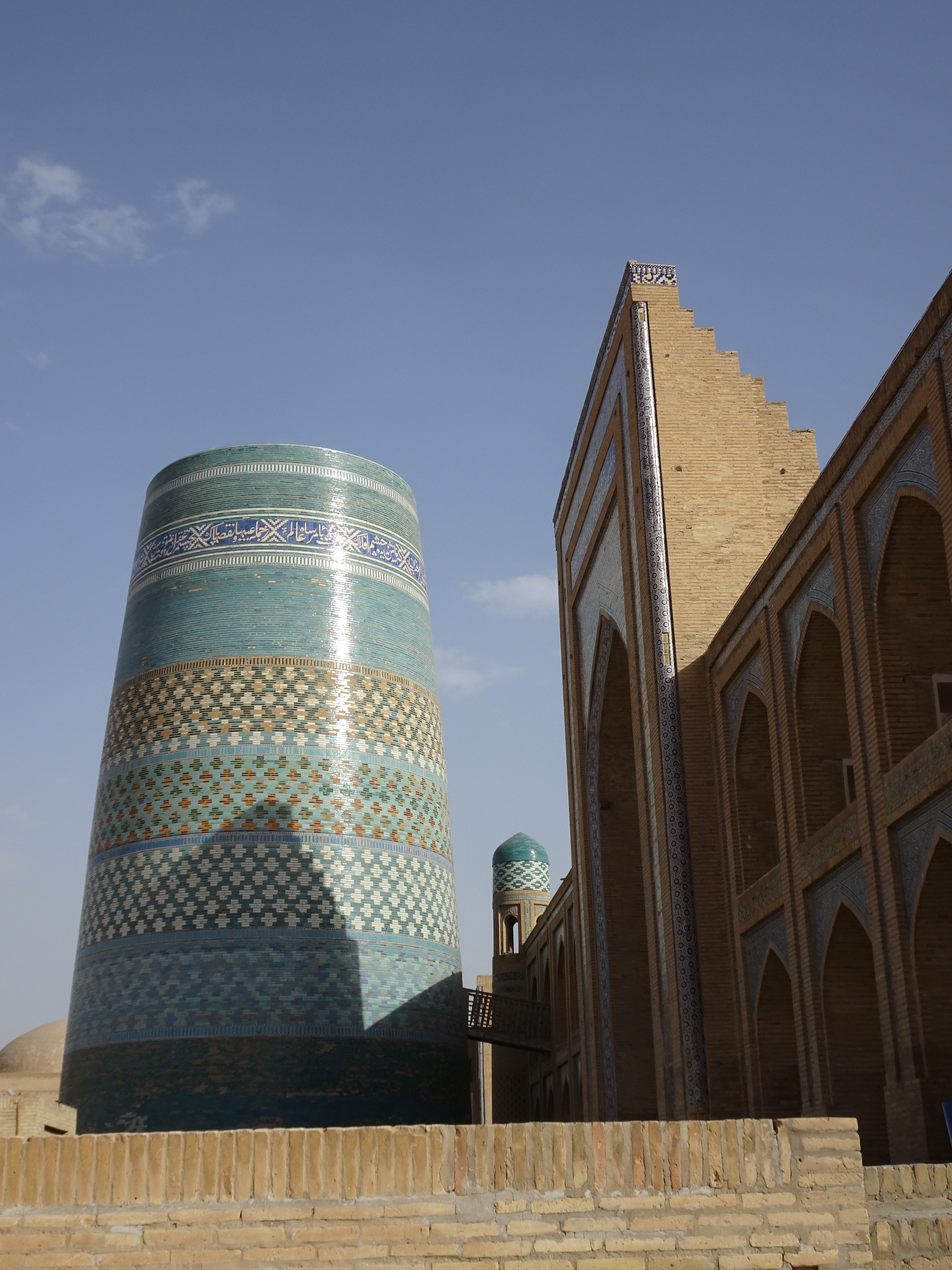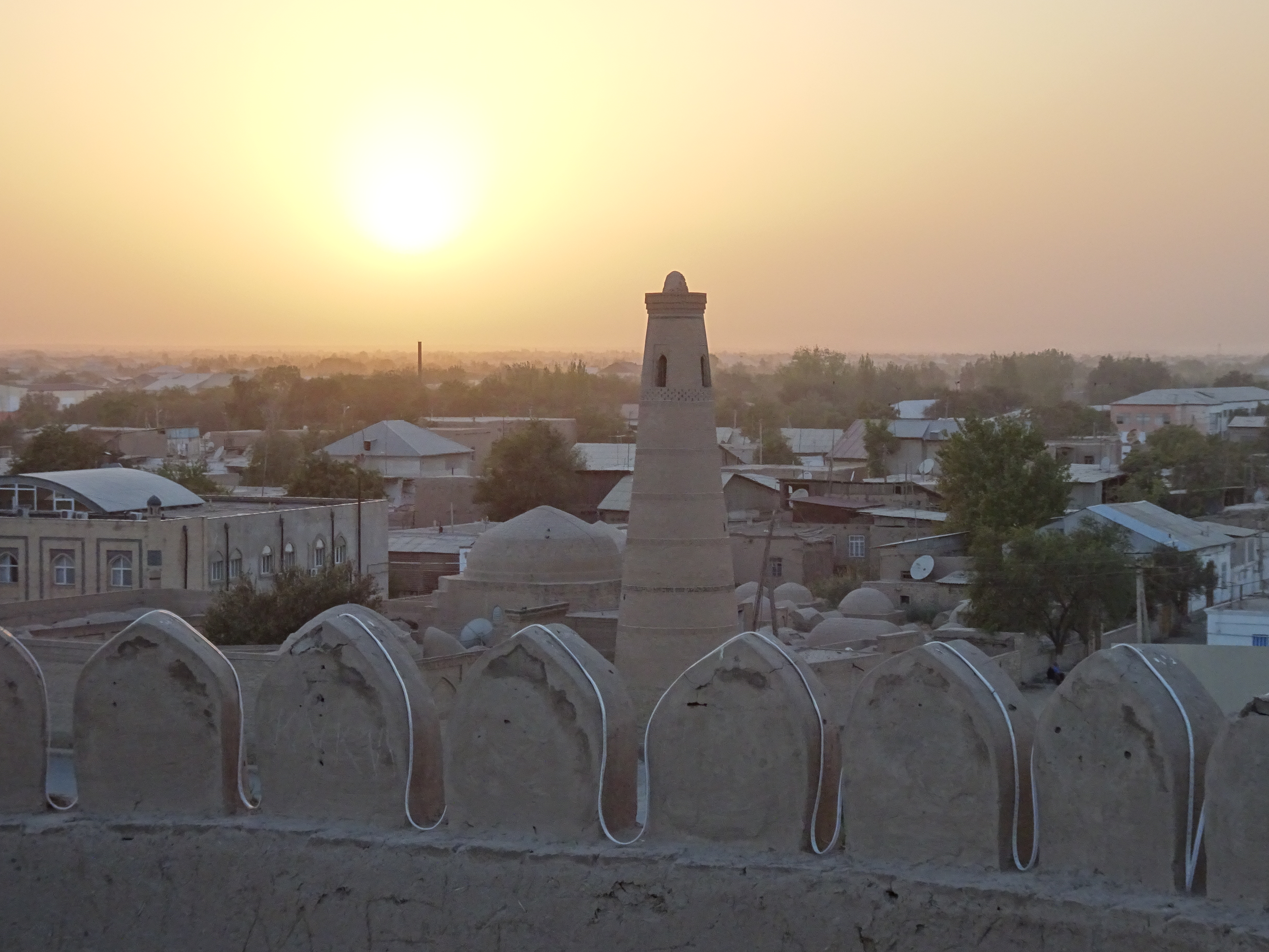 Khiva is a fabulous walled city and my first glimpse of the stunning architecture of Uzbekistan. In particular the half finished minaret with its turquoise, orange and blue diamond checked pattern. It dominates the town and makes a useful marker for orientating yourself, particularly as our hotel is the Madrassa that is attached to it. It is an old Islamic school with rooms on two floors surrounding a peaceful courtyard. I am able to sit on the balcony of my bathroom, look across at the tiled buildings and watch the world go by. I love it!