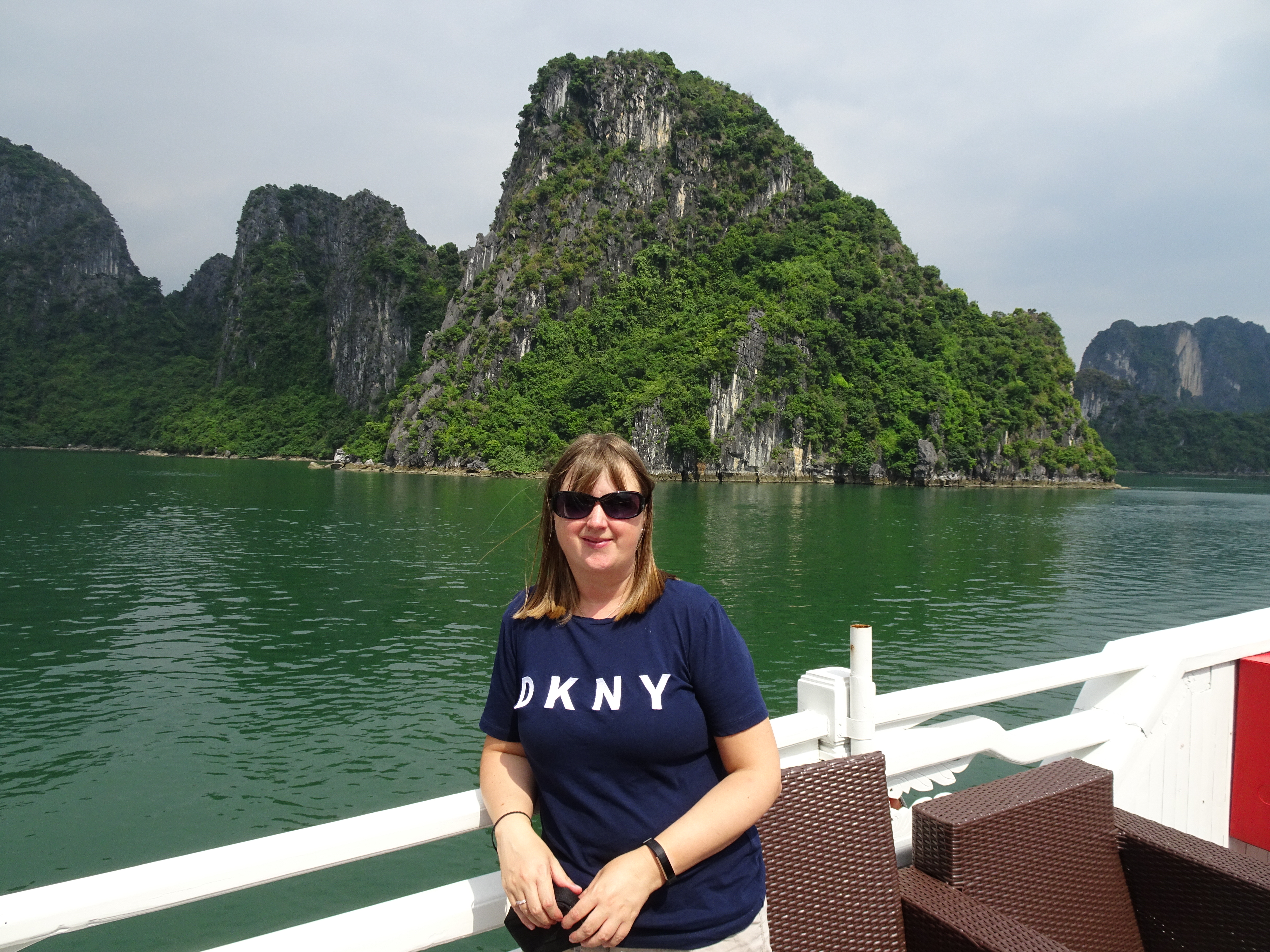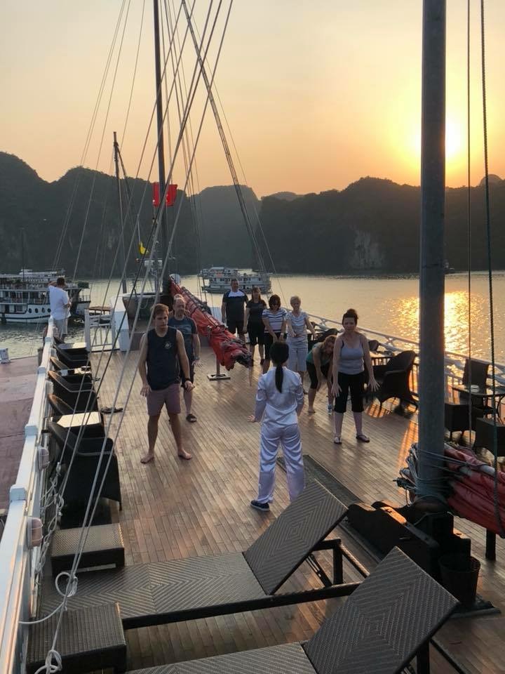 Seeing the limestone karsts of Ha Long Bay set against the blue-green water for the first time is quite something. Our sampan floats through the rock pillars where the vegetation clings precariously by the roots. We are all up on deck taking numerous photos of the scenery or lounging in the cane chairs watching the world go by. Off the boat, panting up the steep steps we enter an enormous cave made up of three joining caverns. Stalactites cling on in the orange light.  Another outing off the boat sees us drifting through a cave entrance that opens out into a lagoon. Monkeys scamper down the hanging trees to be fed the bananas brought by the guide. Waking up early to do Tai Chi on the top deck as the sun rises behind us is an unexpectedly magical experience.