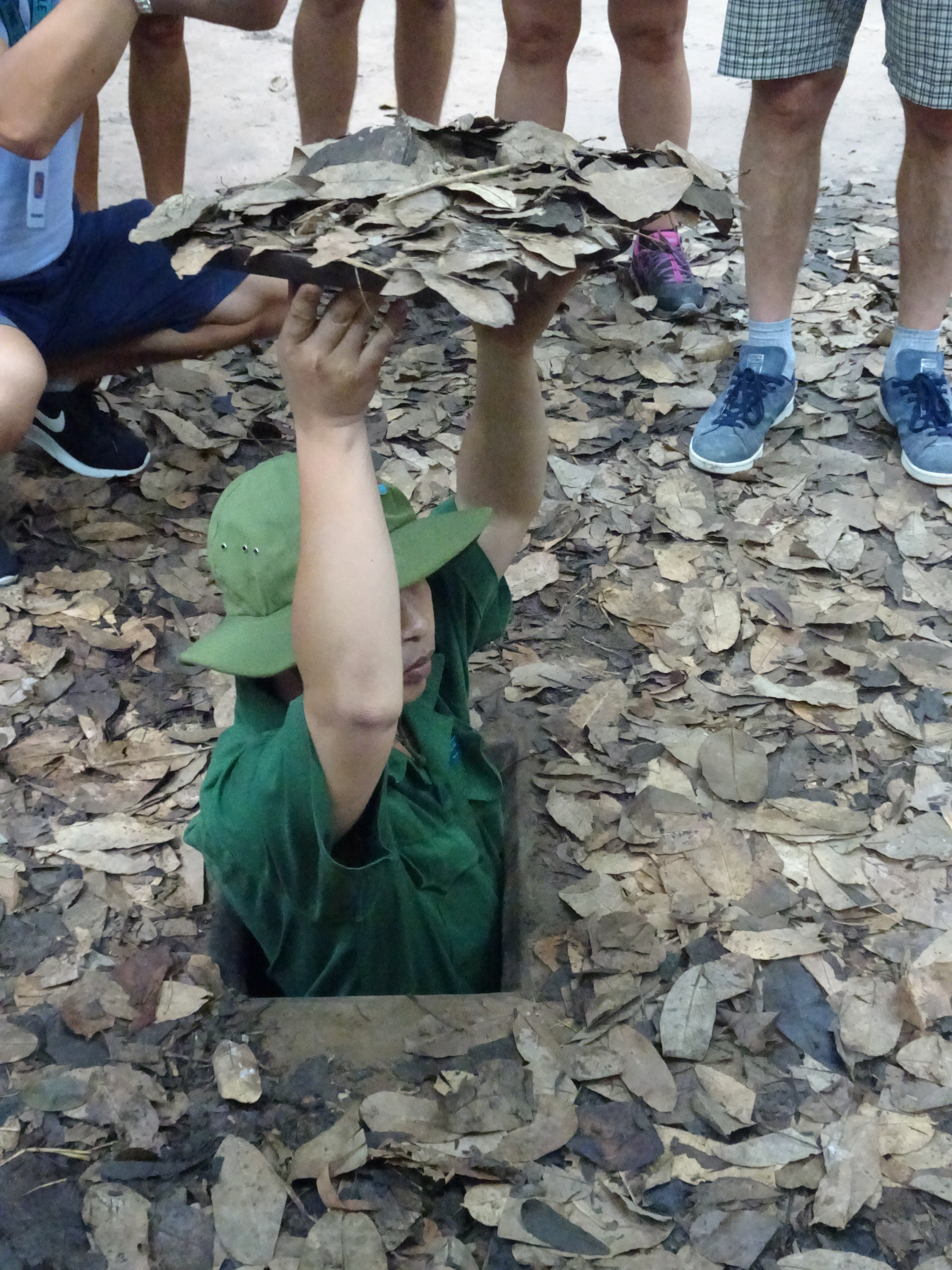 The thought of being a Viet Cong soldier spending days underground in the 75 miles of tunnels at Chu Chi fills me with dread. Spiked traps and rotating devices protect the entrances to each tunnel. Termite mounds hide the places where there are ventilation shafts. Some of our group try crawling through a short length of tunnel. Even the fact that these have been widened to fit tourists does not encourage me to join in.