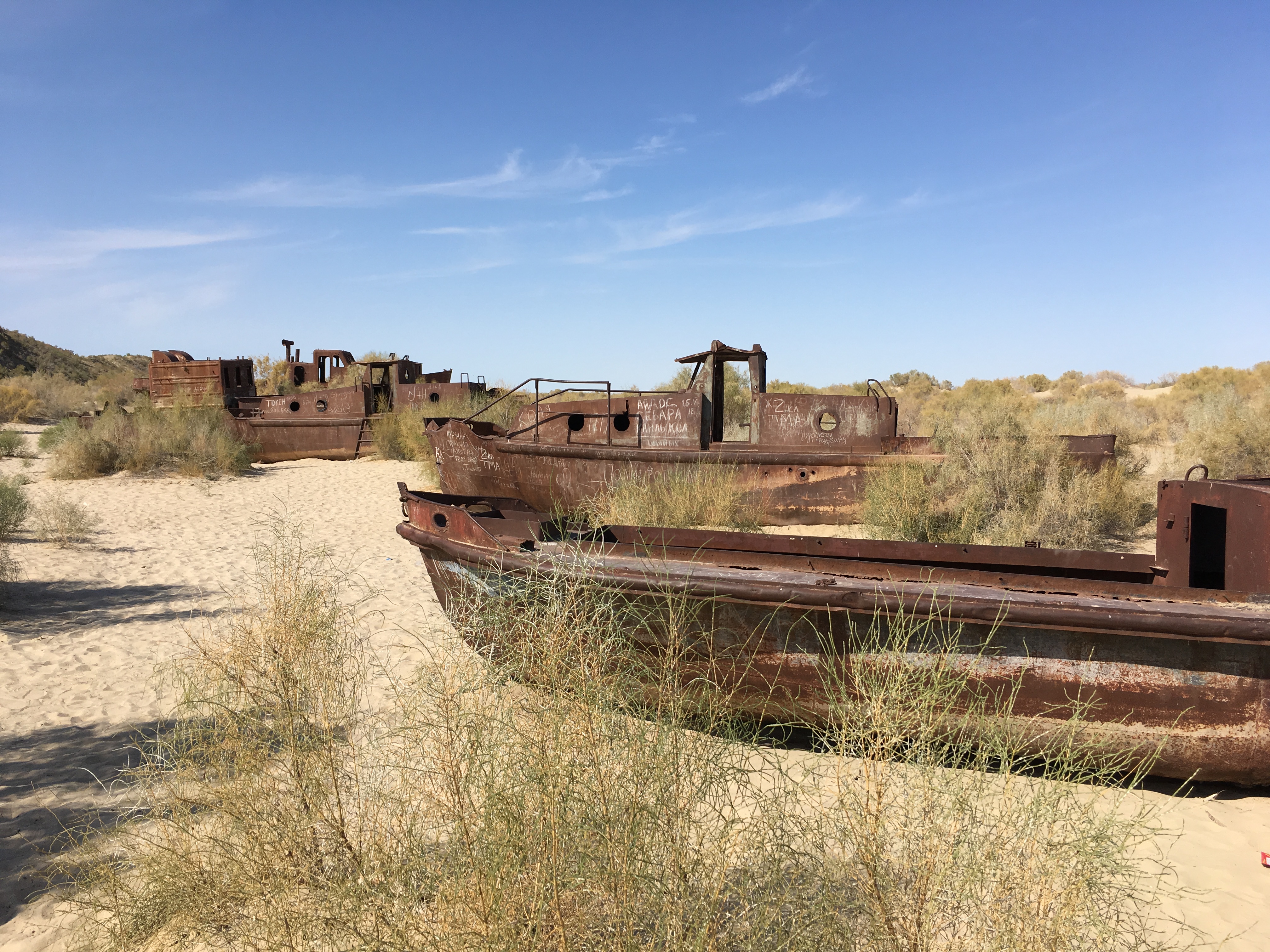 Yesterday on the same bumpy 4 x 4 journey we stopped at a town called Moynaq. In the museum are paintings poignantly depicting the place as it was – a thriving fishing town with a busy canning factory. Now the rusted hulks of the fishing vessels are run aground on the left over sand. In the 1960s the Soviet Union, diverted two of the rivers that flow into the Aral Sea for irrigation purposes. The lake which was once the fourth largest lake in the world, may eventually dwindle away to nothing.