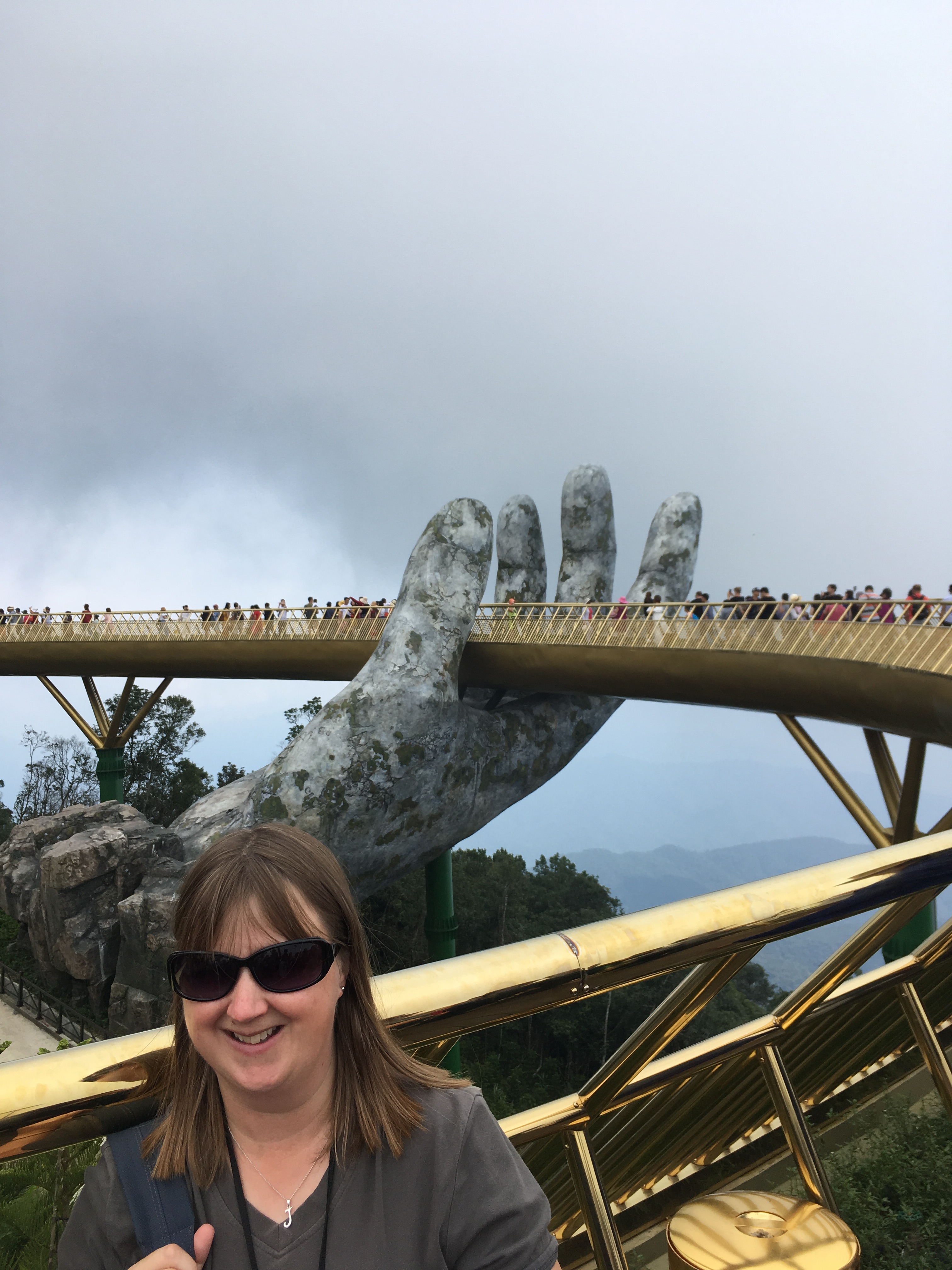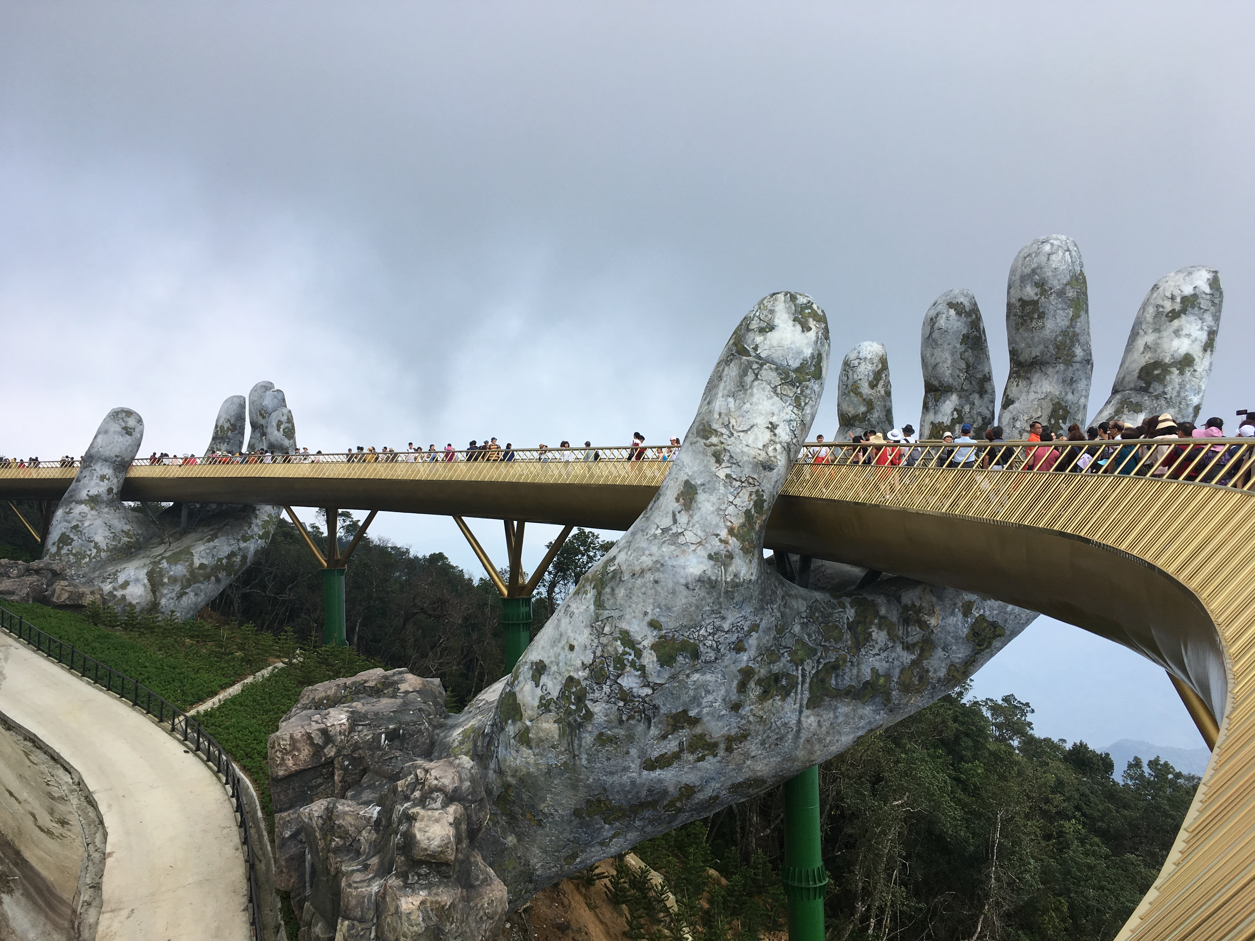 The giant hands reach out from the mountainside and grab hold of the curved bridge. The hands look ancient like they are carved from the rock. The bridge shines gold in the sun.  The bridge that I’ve been wanting to see for a while is part of the recently opened theme park of Sun World, Ba Na Hills near Da Nang. You glide up to the top of the mountain on an Austrian designed cable car. The bridge itself is a stunning piece of architecture especially when set against the backdrop of the hills.
