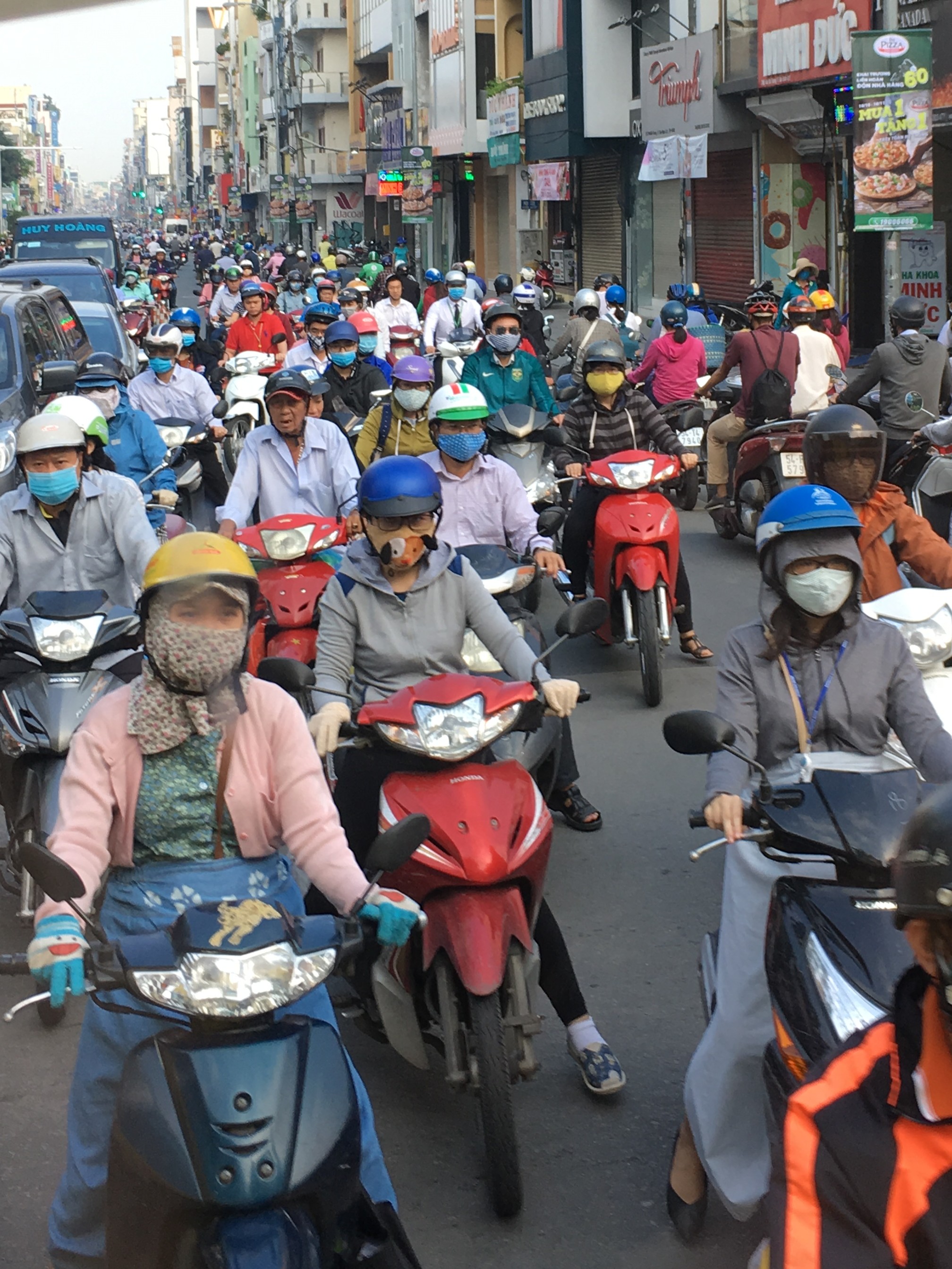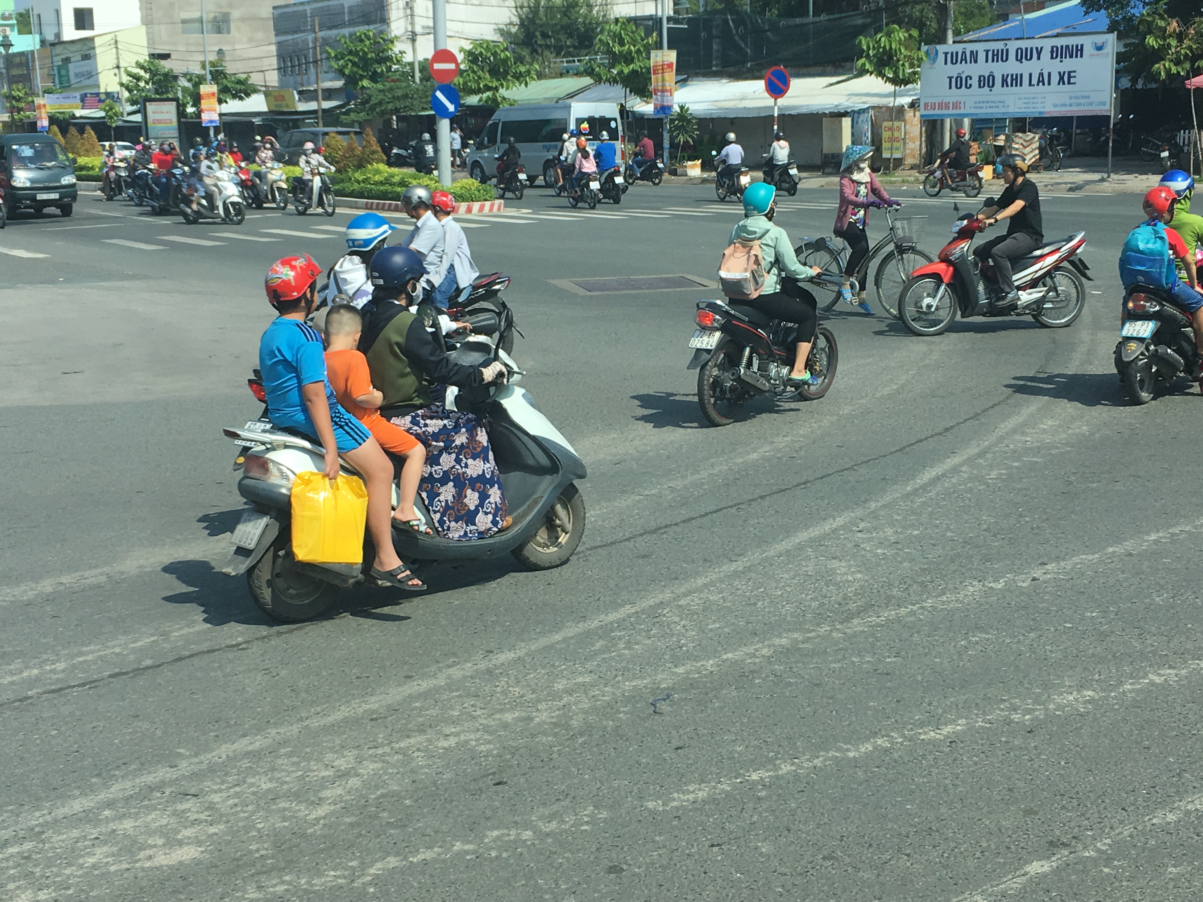The scooter is the chosen method of transport for thousands of people in Vietnam. Scooters zip in and out of each other, weaving through the narrow streets in an acrobatic and almost invisibly coordinated manner. The number of passengers varies. A woman covered in an all in one suit to protect her from the sun, alternates with a family of four going out on a day trip. People get round the compulsory law for wearing helmets by accessorising with cheap horse riding style headgear which offer no protection to the head at all. Scooters seem to be used to carry a whole variety of things including planks of wood, cages of chickens, boxes of food, baskets of fruit,  pieces of furniture including on one occasion, a child’s wardrobe and a large flat screen tv.
