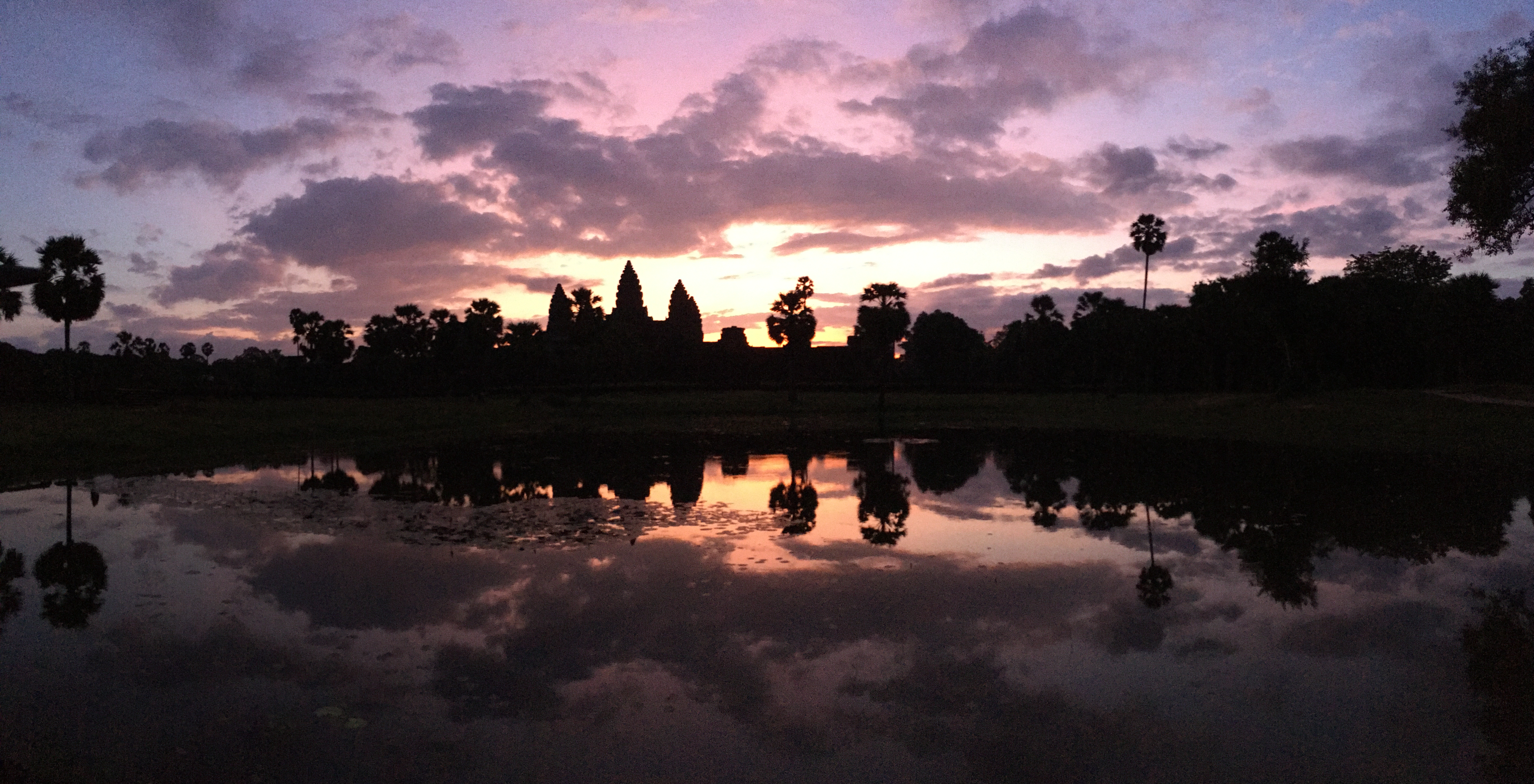 A slight glow outlines the edges of the temple against the black of the early morning sky; our first glimpse of Angkor Wat. As we watch the sky turn pink behind the building, we see its towers reflected in the pool in front. Despite the number of people gathered to watch there is a feeling of peacefulness. Thousands of photos are taken – one for each moment that the sky changes colour.  We stay, eyes fixed on the temple, until the sun is nearly up.